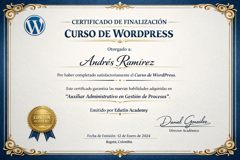 Si. Al finalizar el curso obtienes un Certificado de Completitud en “Auxiliar Administrativo en Gestión de Procesos” emitido por Edutin Academy.