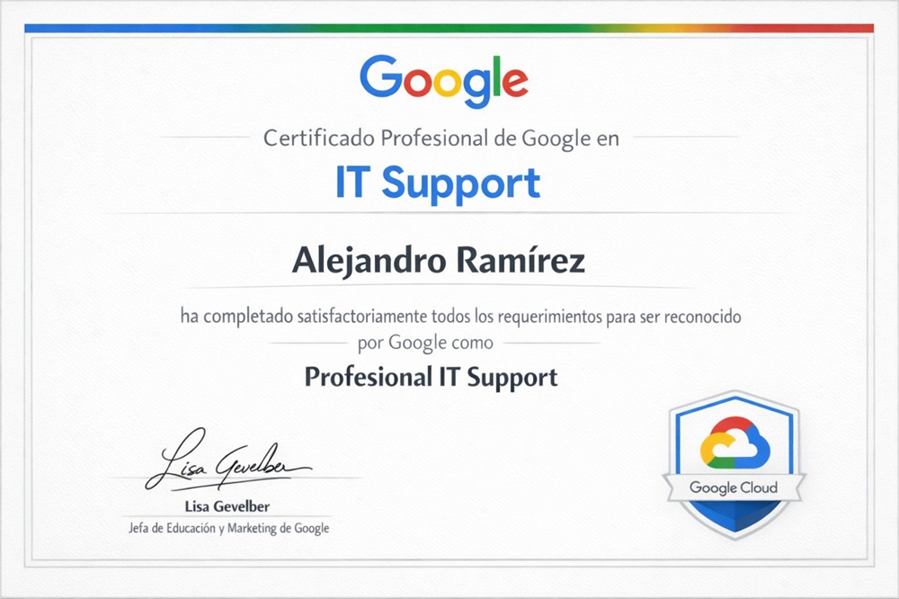 Esta capacitación forma parte de los certificados profesionales de Google y tiene como objetivo prepararte para tus primeros trabajos en soporte técnico.