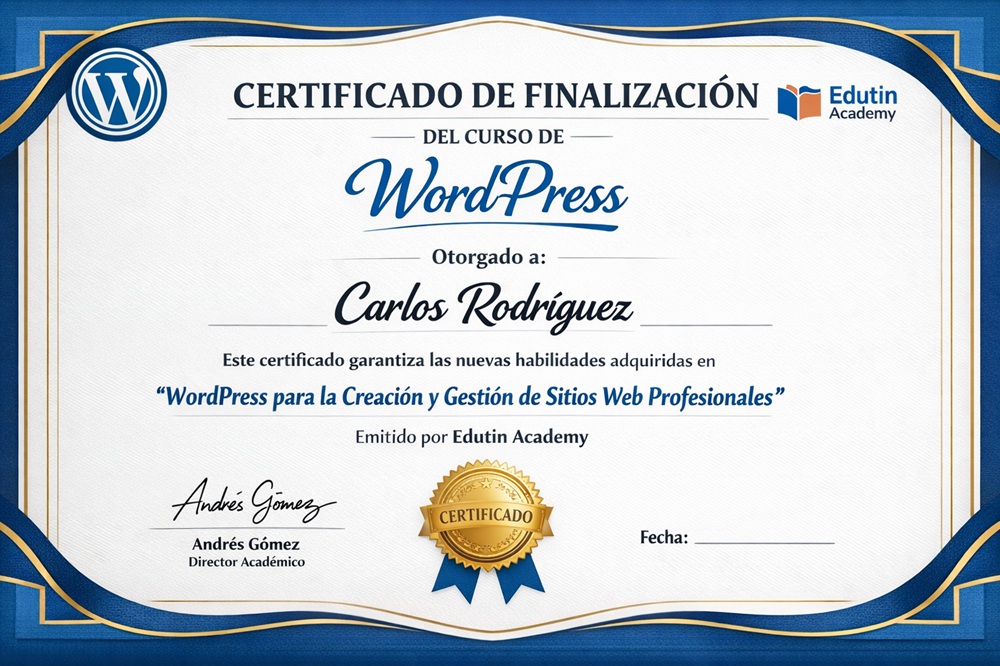 Sí, recibirás un certificado de completitud que garantiza tus conocimientos en “WordPress para la Creación y Gestión de Sitios Web Profesionales” emitido por Edutin Academy.